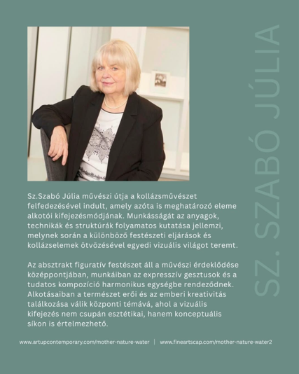 Szalma Ida Júlia a nevem, alkotói nevem: Sz.Szabó Júlia, 1951-ben születtem Kolozsváron. 1987. óta élek Budapesten. Nyugdíjazás előtt fordító-tolmács voltam az OFFI- nál 22 éven keresztül. Mindig szerettem volna festésben kifejezni magam, de a körülmények nem voltak adottak, ez a csak a Magyarországra való áttelepülésem után lett lehetséges. Alkotásaimban a színes világ különböző területeiről merítem a témákat a megszerzett ismeretek technikáinak kombinálásával.